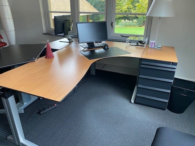 Nog prachtig hoekbureau met ladenblok. Niet elektrisch verstelbaar.